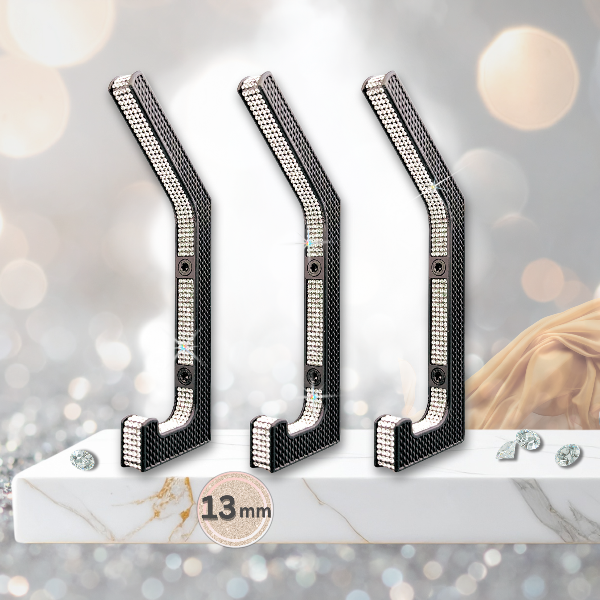 Die handgefertigten glämfän® Garderobenhaken verbinden stilvollen Glamour mit langlebiger Funktion. Jeder Haken wird regional in Deutschland produziert und besteht aus hochwertigem Bio-Kunststoff in edlem Schwarz. Veredelt mit funkelnden Strasssteinen, wird er zum stilvollen Blickfang in Flur, Schlafzimmer, Ankleidezimmer oder Boutique.